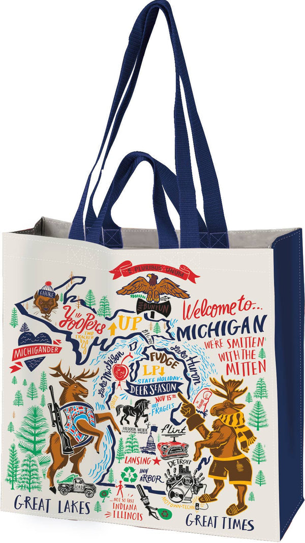 A state pride market tote bag from our Localization Collection featuring double-sided Michigan-oriented sentiments, illustrations, and captions with a state outline and coordinating designs. Our Michigan tote bag complements well with coordinating pieces in collection for a cohesive display. Contains dual nylon hand and shoulder straps with an interior pocket accent.