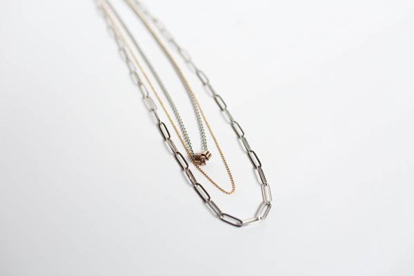 About This Product: * Stainless steel curb chain and paper clip chain * Delicate brass ball chain * 20.5" total length - chains vary from 16-20" * Copper automotive brakeline "beads" * Easy open/close stainless steel slide lock multi-chain clasp Semi-precious, handle with care.