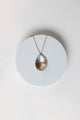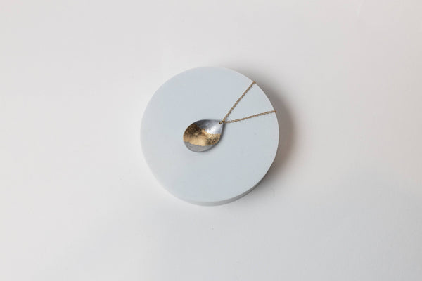 Within Aluminum Teardrop Gold Plated Necklace Aluminum car scrap reshaped into a teardrop shaped pendant with a dash of gold leaf hangs from a delicate gold plated chain.