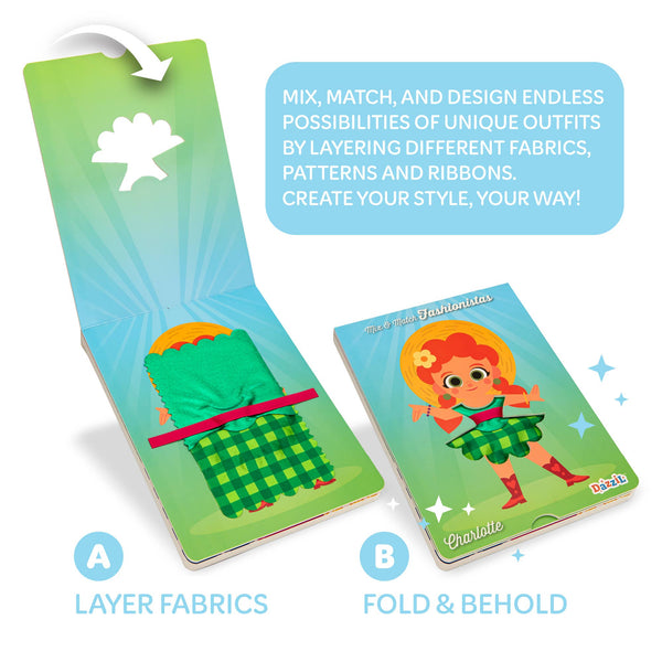 Get ready for endless fashion fun—no sewing, glue, or scissors needed! With Mix & Match Fashionistas, kids can unleash their inner designer by layering fabric pieces to create stylish outfits again and again. Just open the frame, place and layer the fabrics, close it, and reveal a fabulous new look. Then start all over with a brand-new style! Each set includes 20 unique fabric pieces, a storage unit to keep everything organized, and one of six different Fashionistas to dress.