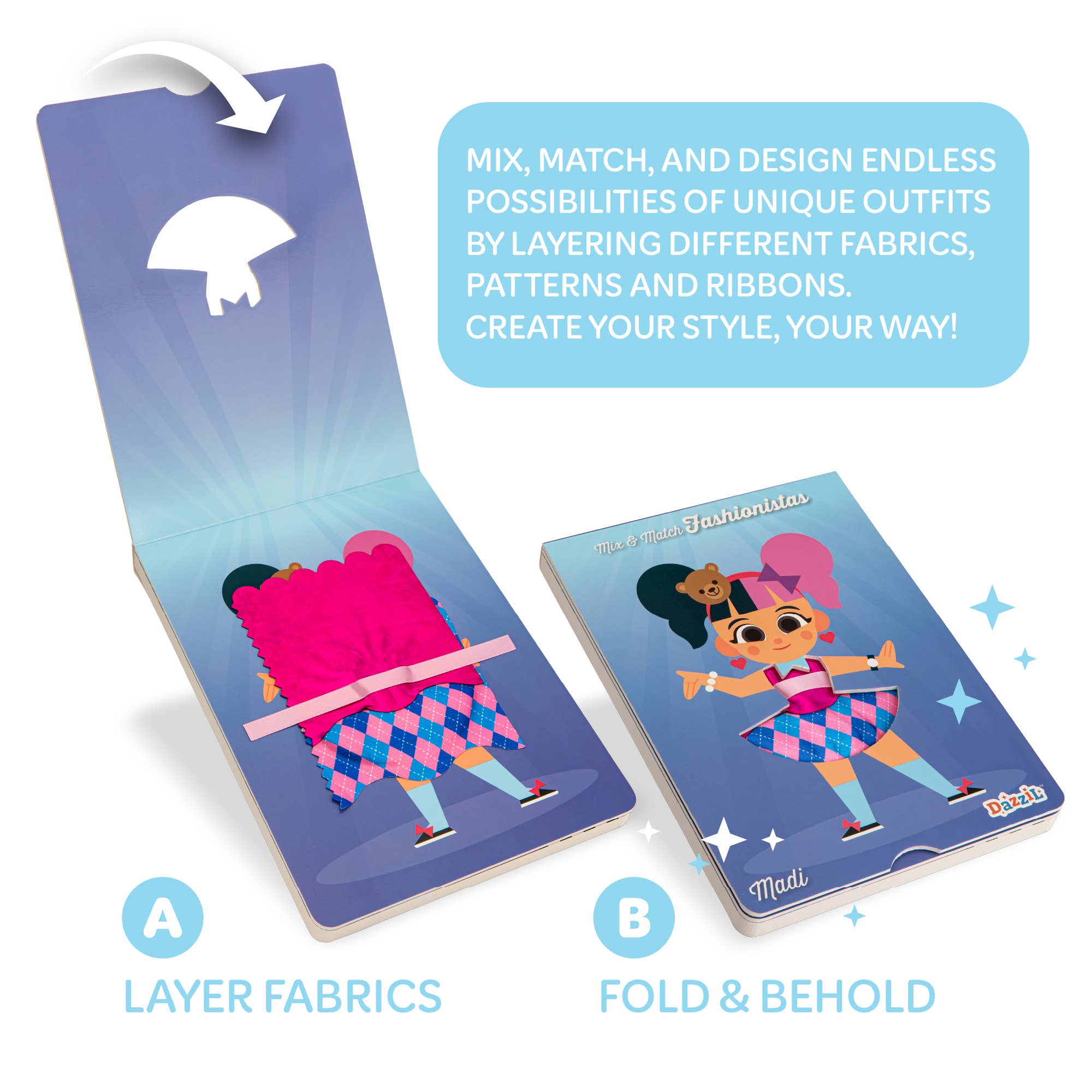 Get ready for endless fashion fun—no sewing, glue, or scissors needed! With Mix & Match Fashionistas, kids can unleash their inner designer by layering fabric pieces to create stylish outfits again and again.