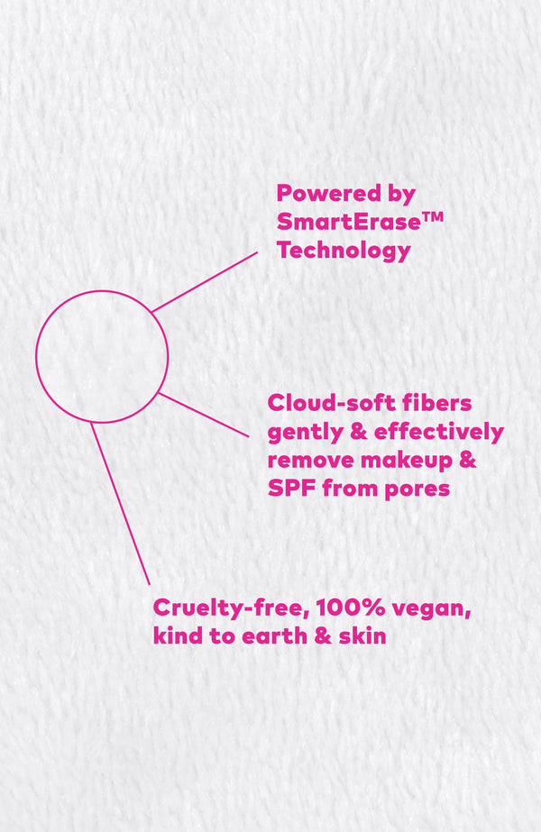 Erase all makeup with JUST WATER™ including waterproof + SPF. Our patented, water-activated, cloud-soft fibers gently & easily remove all makeup & sunscreen from pores. 2 in 1 benefit: one side erases makeup & one side exfoliates skin.