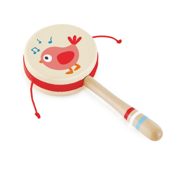 Hape Rattle Drum The Twittering Bird Drum-shaped Rattle is a fresh twist on the classic traditional Chinese toy. Features a cute twittering bird print on the drum. When spun, the rattle emits a soothing bell-like sound as the string’s knots hit the drum.