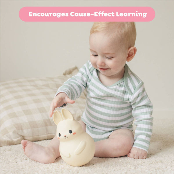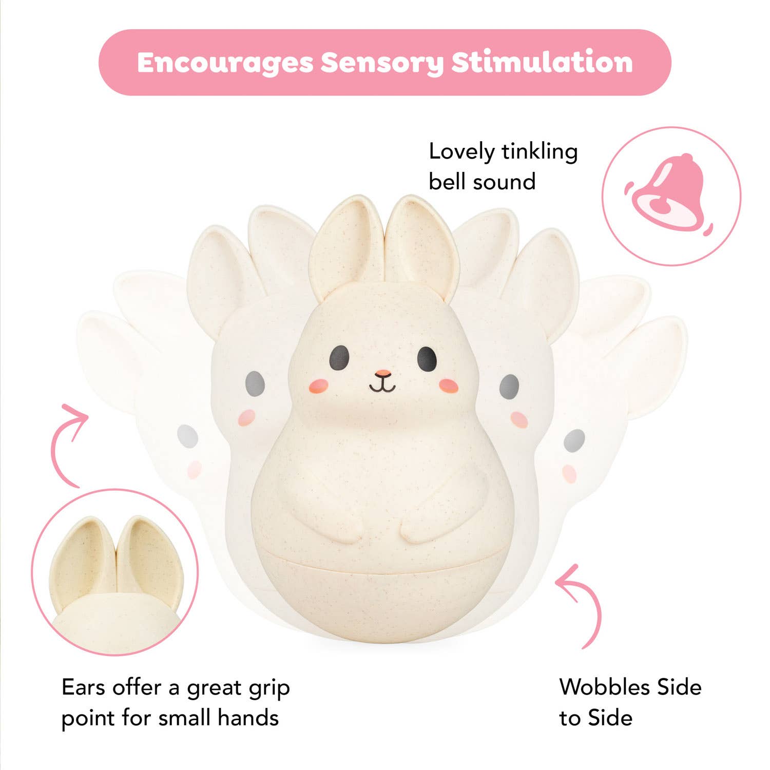 Roly Poly Bunny loves being pushed, pulled or knocked over - always bobbing up for more fun. The rounded, weighted bottom will always spin him back upright for more play. and as he rolls around he makes a lovely tinkling bell sound, for additional sensory stimulation.
