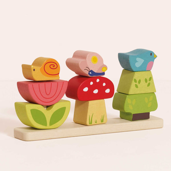 A charming wooden toy with 9 colorful pieces to stack. Budding nature lovers will adore this sweet educational toy, perfectly sized for little hands and developing imaginations. Build the toadstool, tree and flower and top with a little garden friend.