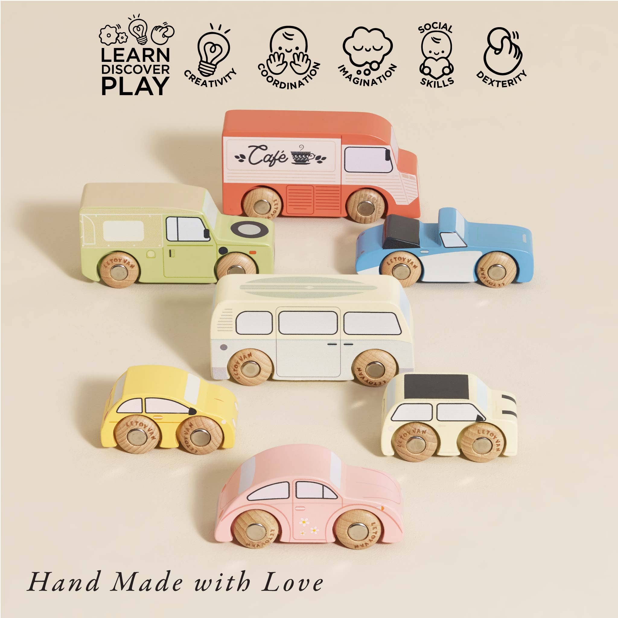 A delightful collection of 7 wooden vintage toy cars designed to captivate both children and adults alike. Crafted with meticulous attention to detail, these miniature vehicles exude a timeless charm and capture the essence of numerous iconic cars. They will transport you to the golden era of classic automobiles! Bright colored design used to stimulate imagination and help develop cognitive skills, dexterity and hand-eye coordination.