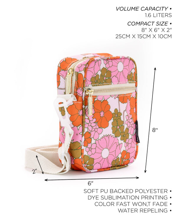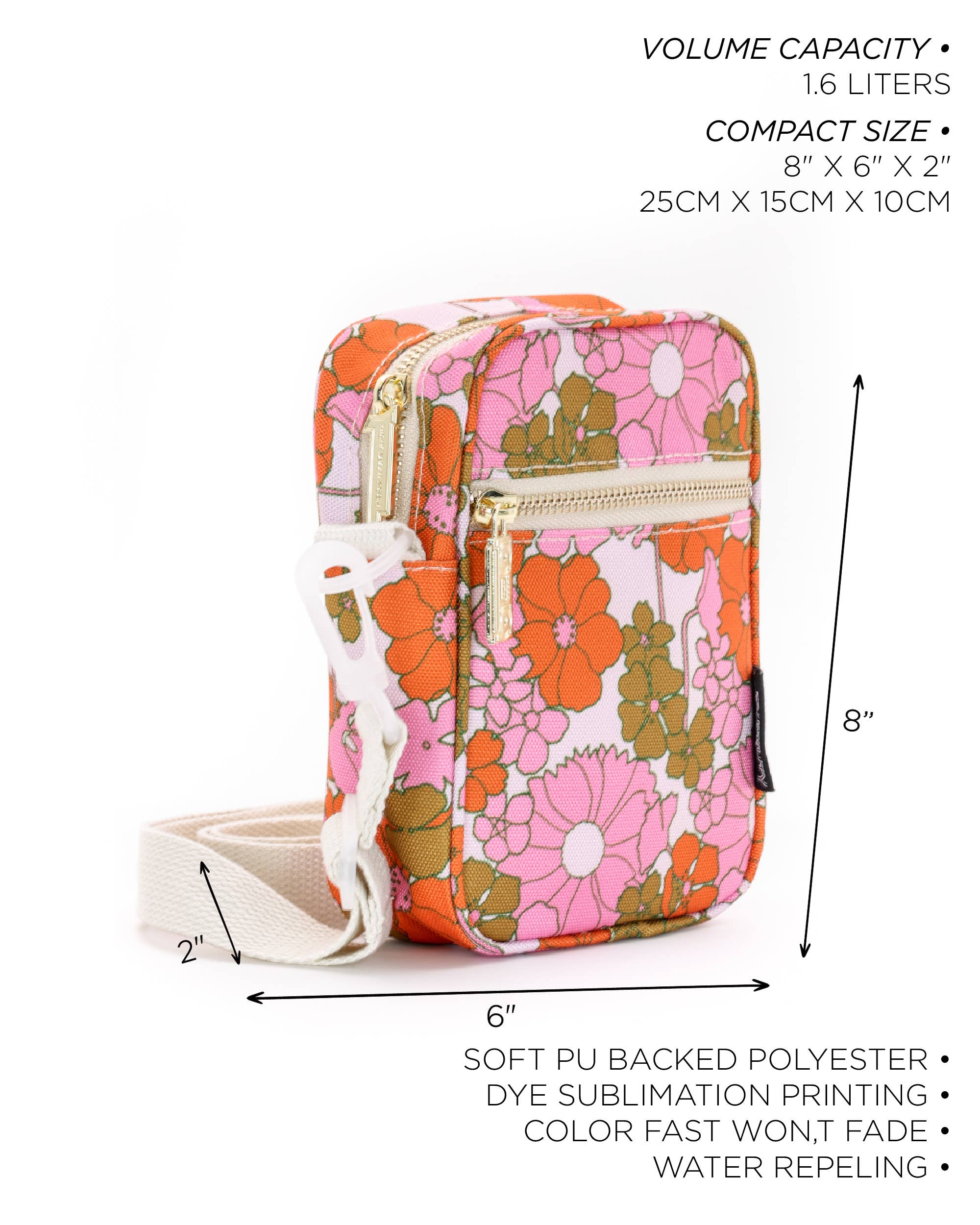 SPECIFICATIONS Dimensions: 8" x 6" x 2" (20.3 cm x 15.2 cm x 5.1 cm) Volume: Approximately 2.4 liters Strap Length: Adjustable from 26" to 52" Pocket Details: Main pocket with a double zipper Inside slip pocket Front zipper pocket