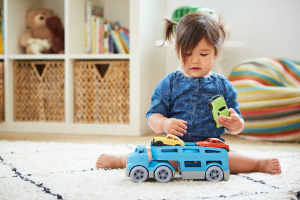 The double-decker Green Toys™ Car Carrier features two working ramps and space for three Mini Cars. With no metal axels or small parts, it’s great for both indoor and outdoor play, and encourages motor skill development and imaginative, creative play. The 5 piece set includes cab with detachable trailer and 3 brightly-colored Mini Cars.